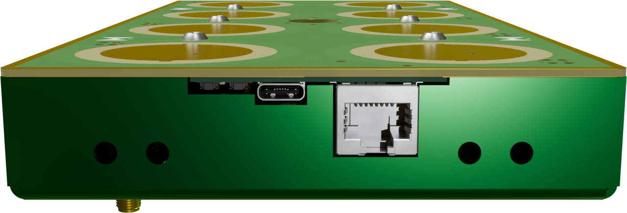 - Combined Arrays: There are two pairs of M4-sized holes on all four sides of the ESPARGOS case, which can be used to bolt multiple ESPARGOS units together to form larger arrays. One of the holes in the pair could be used for mechanical assembly, the other one can be used to run a small coaxial cable for synchronization.